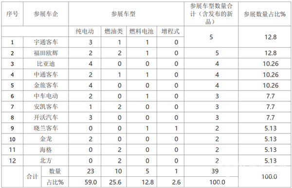 從客車整車企業(yè)參展數(shù)量我們不難看出,這次共有12個(gè)企業(yè)帶來39款客車車型參展,其中宇通、福田歐輝參展車型數(shù)量最多,均為5款,占比均為12.8%,陣容最強(qiáng)大;其次是比亞迪、金旅和中通客車,這三家均帶來4款車型參展,占比均為10.26%;然后是安凱客車、開沃汽車均帶來3款車型參展,占比均為7.7%;第四是金龍、海格和北方客車、曉蘭客車均帶來2款(不含1款燃料電池清洗車)車型參展,占比均為5.13%。