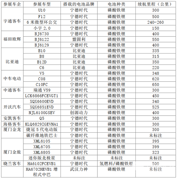 上表顯示,此次展會(huì),宇通客車、福田歐輝、比亞迪、中通客車、中車電動(dòng)、安凱客車、開沃汽車等客車企業(yè),共攜40款整車產(chǎn)品參展,包括29款新能源客車和10款燃油客車以及1款氫燃料電池清洗車。在29款新能源客車中,搭載的電池以磷酸鐵鋰電池為主要技術(shù)路線,電池品牌以寧德時(shí)代占比最高,其次是比亞迪,具體如下表: