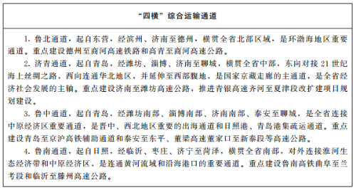 1.完善四橫五縱通道。積極融入國家京津冀—長三角主軸、京哈走廊和京藏走廊。在基本形成魯北、濟(jì)青、魯南三個橫向通道基礎(chǔ)上,加快完善魯中橫向通道,提升沿海港口輻射能力和西向鐵水聯(lián)運效能,積極融入共建“一帶一路”高質(zhì)量發(fā)展;在基本形成沿海、京滬輔助、京滬、京九四個縱向通道基礎(chǔ)上,加快完善濱臨縱向通道,強化與京津冀、長三角區(qū)域連接。
