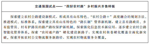 (3)農(nóng)村公路。開展“五年提質(zhì)增效”專項行動,實施路網(wǎng)提升、道路通達(dá)、通行安全保障、融合發(fā)展樣板、運輸服務(wù)升級“五大工程”,助推鄉(xiāng)村振興。新建改造提升農(nóng)村路4萬公里,因地制宜推進(jìn)通建制村雙車道公路建設(shè)和過窄農(nóng)村公路拓寬改造,打造“四好農(nóng)村路”鄉(xiāng)村振興齊魯樣板。路網(wǎng)提升工程。提升新建公路路面結(jié)構(gòu)和技術(shù)標(biāo)準(zhǔn),到2025年底,具備條件的縣(市、區(qū))中心城區(qū)與所轄鄉(xiāng)鎮(zhèn)實現(xiàn)二級及以上公路連接,相鄰鄉(xiāng)鎮(zhèn)實現(xiàn)三級及以上公路連接。強化路域環(huán)境治理,因地制宜設(shè)置停車區(qū)、服務(wù)驛站等配套服務(wù)設(shè)施,完善既有農(nóng)村公路的安全、排水、綠化等配套設(shè)施建設(shè)。道路通達(dá)工程。推動農(nóng)村公路向進(jìn)村入戶傾斜,持續(xù)推進(jìn)村內(nèi)通戶道路硬化,打通斷頭路。到2025年,所有自然村全部通硬化路,村內(nèi)通戶道路硬化基本完成,高標(biāo)準(zhǔn)實現(xiàn)“村村通”“戶戶通”。通行安全保障工程。完成現(xiàn)有四、五類橋梁改造任務(wù)。實施1萬公里村道安全設(shè)施提升試點。加快完善農(nóng)村公路安全防護(hù)設(shè)施,基本消除縣鄉(xiāng)道路安全隱患。融合發(fā)展樣板工程。加強農(nóng)村公路與自然、生態(tài)、文化、科技、產(chǎn)業(yè)等融合發(fā)展,探索“公路+”發(fā)展模式,開展最美農(nóng)村路、鄉(xiāng)村振興路命名活動。到2025年,打造80條特色鮮明、帶動作用大的省級以上融合發(fā)展樣板公路。運輸服務(wù)升級工程。具備條件的地區(qū)推行全域公交,形成城鄉(xiāng)一體、高效快捷、功能完善的農(nóng)村物流網(wǎng)絡(luò)體系。