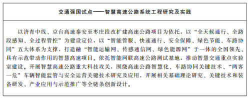 2.建設(shè)兩個智慧化試點工程。按照新基建部署要求,推進(jìn)交通運輸信息化向數(shù)字化、網(wǎng)絡(luò)化、智能化發(fā)展,推動“交通鏈”向“數(shù)據(jù)鏈”轉(zhuǎn)變。加快以智能設(shè)施、車路協(xié)同、船岸協(xié)同等技術(shù)為特征的“智慧高速”“智慧港口”兩個試點工程建設(shè)。開展交通強國“智慧高速公路系統(tǒng)工程研究及實踐”試點,實施濟(jì)青中線、京臺高速泰安至棗莊段智慧高速公路項目,在路網(wǎng)感知、車路協(xié)同、信息化管服等方面實現(xiàn)新突破;利用濱萊高速原址保留路段,打造全國首個面向無人駕駛的智能網(wǎng)聯(lián)高速公路封閉測試基地。完善國家干線公路視頻監(jiān)測網(wǎng)絡(luò),深化電子不停車收費系統(tǒng)(ETC)門架應(yīng)用,推進(jìn)高精度數(shù)字化基礎(chǔ)設(shè)施地圖和交通基礎(chǔ)設(shè)施信息庫建設(shè),實現(xiàn)視頻、氣象、事件檢測等信息云上匯聚、全省網(wǎng)聯(lián)。開展交通強國智慧港口試點,實施自動化集裝箱碼頭、傳統(tǒng)碼頭智能化改造工程和智慧港口信息化建設(shè),打造世界領(lǐng)先的新一代智慧港口。