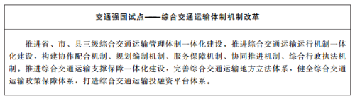 (1)深化體制機制改革。完成“綜合交通運輸體制機制改革”交通強國試點任務(wù),優(yōu)化完善機構(gòu)職能,深入推進(jìn)交通運輸綜合執(zhí)法改革。持續(xù)探索交通運輸主管部門對重點交通運輸企業(yè)履行業(yè)務(wù)指導(dǎo)和監(jiān)管職能的新模式,完善行業(yè)指導(dǎo)監(jiān)管機制,構(gòu)建事權(quán)清晰、有機銜接、政令暢通、協(xié)同高效的一體化綜合交通運輸體制機制。
